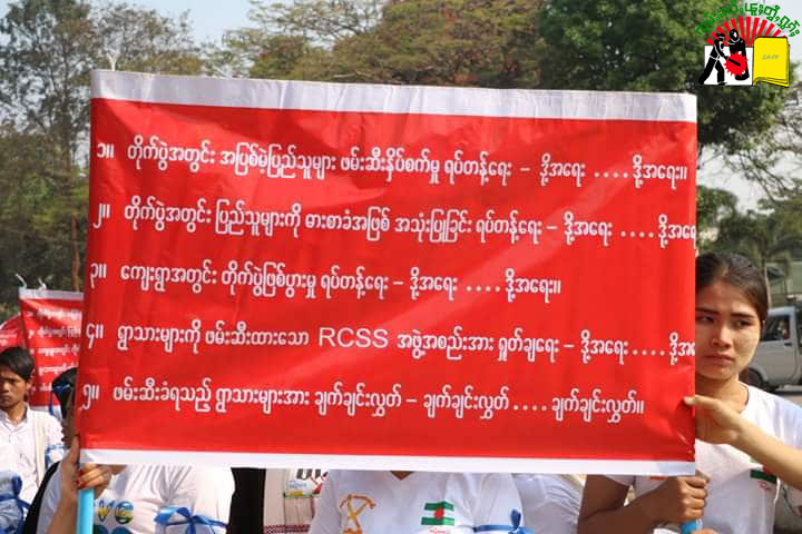 ဆန္ဒပြပွဲတွင် -RCSS မှဖမ်းဆီးထားသော မန်လီရွာသား ၁၂ ဦးအပါအဝင် နမ္မတူဒေသခံများ အားလုံး ကိုခြွင်းချက်မရှိအမြန်ဆုံးလွှတ်ပေးရန်၊ ရိုးသားစွာလုပ်ကိုင်စားသောက်နေသည့် တိုင်းရင်းသား လူမျိုး အချင်းချင်း လူသားချင်းစာနာထောက်ထားရန်၊ ရွာသားများကိုဖမ်းဆီးထားသည့် NCA လက်မှတ်ထိုး ထား သော RCSS က စာချုပ်ပါအချက်အလက်များကိုလိုက်နာရန်၊ လက်နက်ကိုင်အဖွဲ့အစည်းများမှ တိုင်းရင်း သားပြည်သူလူထုအပေါ်လူ့အခွင့်အရေးချိုးဖောက်နေမှုများအားရပ်တန့်ရန်၊ RCSS မှရွာသားများ ကို ဖမ်းဆီး ထားကြောင်းသတ္တိရှိရှိဝန်ခံရန် -အစရှိ ဆိုင်းဘုတ်ကိုင်ဆောင်ပြီး စီတန်းလမ်း လျှောက်ကြ သည်။