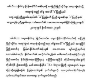 ICJ တွင် နေပြည်တော်အစိုးရ သွားရောက်တရားရင်ဆိုင်မည့်အမှုမှာ အစိုးရ၏တာဝန်ယူမှု တာဝန်ခံမှု ကိုပြသခြင်းဖြစ်ကြောင်း၊ အမှန်တရားနှင့်တရားမျှတမှုကို ဖော်ထုတ်နေခြင်းဖြစ်ကြောင်း၊ ပြည်ထောင် စုမြန်မာနိုင်ငံမှ လက်မှတ်ရေး ထိုးထားသော နိုင်ငံတကာ ပဋိညာဉ်စာချုပ်စာတမ်းများအား လိုက်နာဆောင် ရွက်ခြင်းအပြင်၊ အမျိုးသားပြန်လည်သင့်မြတ်ရေး၊ ပြည်တွင်းငြိမ်းချမ်းရေးကို အမြန်ဆုံး အကောင်အထည် ဖော်ခြင်းသည် နိုင်ငံတကာအသိုင်းအဝိုင်းတွင် တိုင်းပြည်၏ပုံရိပ်မြင့်မား လာစေမည်ဖြစ်ကြောင်း အချက် ၅ ချက်ဖြင့်ထုတ်ပြန်သည့် ကြေငြာချက်၏ နံပါတ် ၄ အချက်အတွင်း ဖေါ်ပြထားသည်။