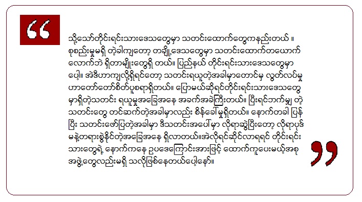 မေး။ ။ နောက်တခုက လွတ်လပ်စွာ ရေးသားခွင့် ထုတ်လွှင့်ခွင့် အမှန်တကယ် ရရှိဖို့ လူထုကော အစိုးရကော ဘယ်လိုလုပ်သင့်ပါသလဲရှင့်။