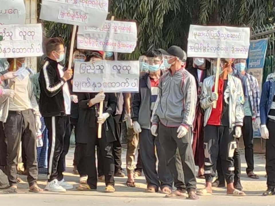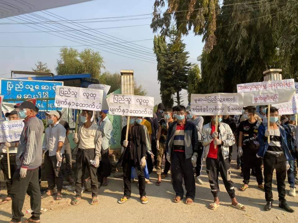 ဆန္ဒပြသူများသည် “ ပြည်သူလူထု မျက်နှာထောက်ပါ” “ မူဆယ်ပြည်သူ့ဆေးရုံ အမြန်ဖွင့်လှစ်ရေး ဒို့အရေး” “ CDM လှုပ်ရှားမှု ဆရာများချက်ချင်းရပ်”ဆိုသည့် ဆိုင်းဘုတ်ကိုင်ပြီး ဆေးရုံရှေ့တွင် ရပ်ပြီး ဆန္ဒထုတ်ဖော်ကြသည်။