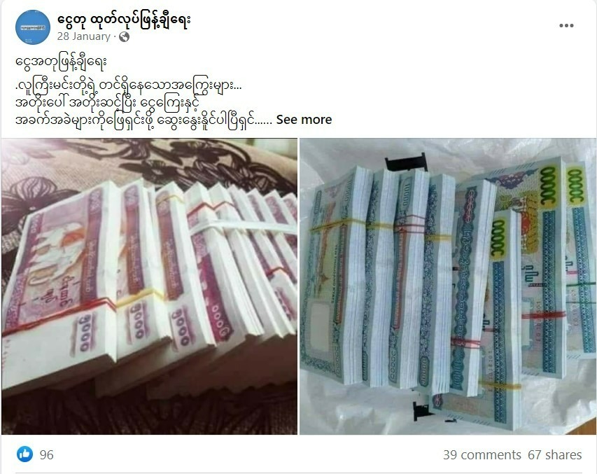 လက်ရှိ အာဏာသိမ်းကာလ တနှစ်ကျော်ရှိလာချိန်တွင် ငွေအတုများသည် “မြန်မာငွေအတုရောင်းဝယ်ရေး” ၊ “MONEY. TALKS ငွေအတုရောင်းဝယ်ရေး“ စသဖြင့် အမည်ရှိသည့် လူမှုကွန်ယက်စာမျက်နှာ Page တို့ဖြင့် ပေါ်ပေါ်ထင်ထင် ရောင်းဝယ်လှဲလှယ်နေပြီး တချို့သောမြို့နယ်များကို ကားဂိတ်မှတဆင့် ပို့ဆောင်ပေးနေကြောင်း ရေးသားဖော်ပြထားသည်။