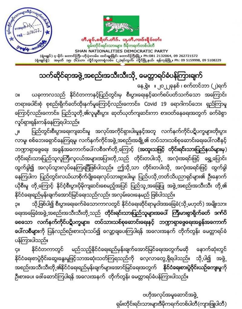 လက်နက်ကိုင်တပ်ဖွဲ့အချို့၏ တပ်သားစုဆောင်းရေးပေါ်လစီနှင့် ဘဏ္ဍာရှာဖွေရေး အခွန်အကောက်ပေါ်လစီများ ပြန်လည်လျော့ချပေးရန် ရှမ်းတိုင်းရင်းသားများဒီမိုကရက်တစ်ပါတီ (SNDP) ကျားဖြူပါတီက တောင်းဆိုလိုက်သည်။