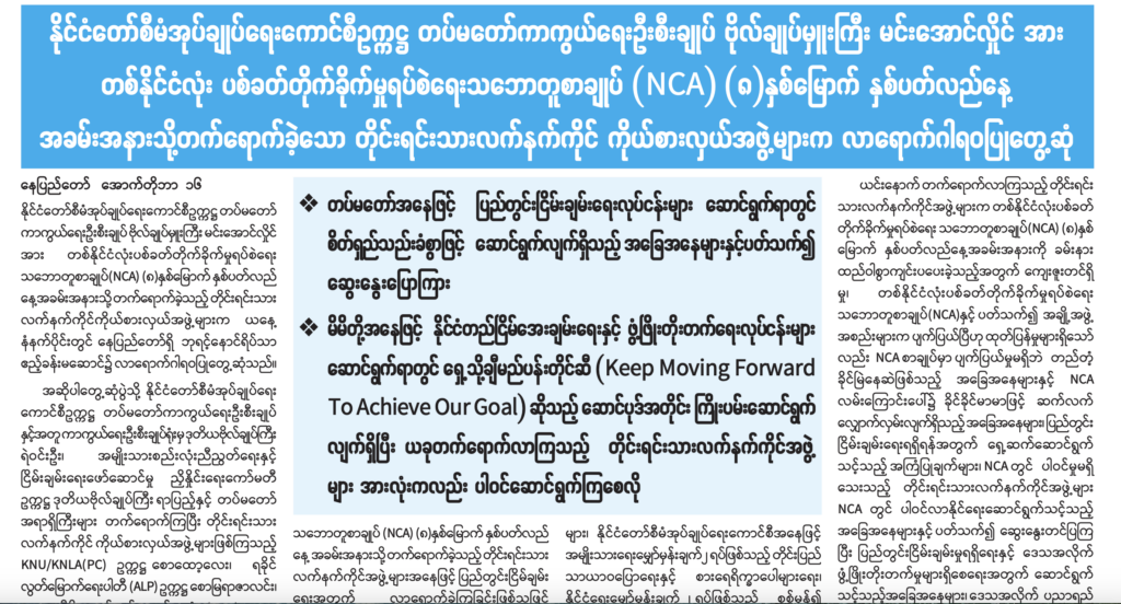 သို့ပေမယ့် တစ်ချိန်က တန်းတူညီမျှရေး အမျိုးသားရေး၊ အာဏာရှင်ဖျက်သိမ်းရေး ကြွေးကြော်ခဲ့သော တိုင်းရင်းသားခေါင်းဆောင် အချို့သည် အာဏာသိမ်း စစ်ခေါင်းဆောင် မင်းအောင်လှိုင် ဦးစီးကျင်းပသည့် NCA ကို မျှော်လင့်ချက်နှင့် တပျော်တပါး သွားရောက်ခဲ့ကြသည်။
