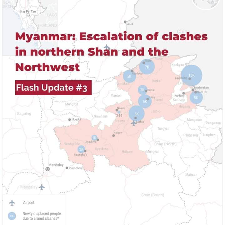 အောက်တိုလာလ ၂၇ ရက်မှ စ၍ သျှမ်းပြည်မြောက်ပိုင်းရှိ မြို့နယ် ၂၂ ခုတွင် အနည်းဆုံး မြို့နယ် ၉ ခု၌ တိုက်ပွဲများဖြစ်ပွားခဲ့သဖြင့် လူဦးရေ ၅၀,၀၀၀ ခန့် နေရပ်စွန့်ခွာ ထွက်ပြေးနေရသောကြောင့် မရှိမဖြစ်လိုအပ်နေသည့် အခြေခံစားနပ်ရိက္ခာနှင့်ကယ်ဆယ်ရေးပစ္စည်းများကို စစ်ဘေးရှောင်ပြည်သူများထံ ထောက်ပံ့ပေးသွားမည်ဖြစ်ကြောင်း UNOCHA ၏ နိုဝင်ဘာလ ၉ ရက် ထုတ်ပြန်ချက်အရ သိရသည်။