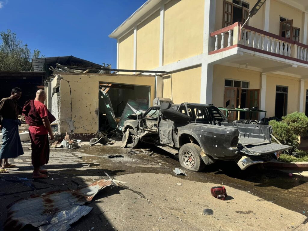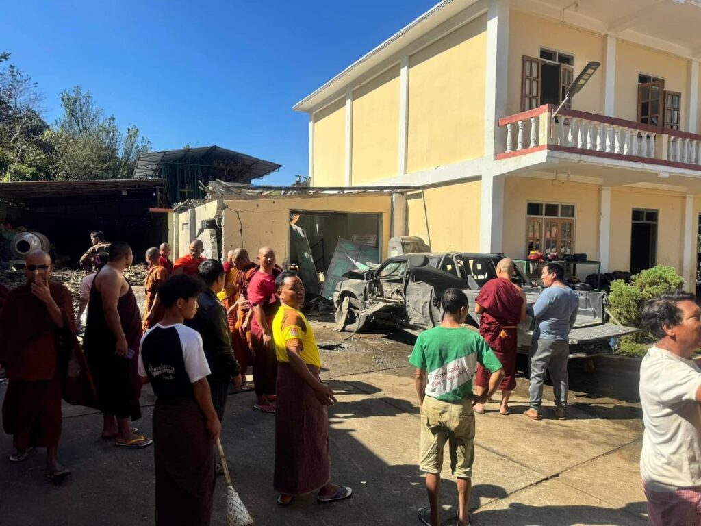 ဒရုန်းဗုံးပြုတ်ကျ ပေါက်ကွဲမှုကြောင့် ကိုရင်ကြီးတစ်ပါး ပေါင်ထိခိုက်သွားပြီး ဘုန်းကြီးကျောင်းဆောင် (၃)ဆောင် နှင့် ကား ၂ စီးပျက်စီးသွားကြောင်း ဒေသခံများက ပြောသည်။