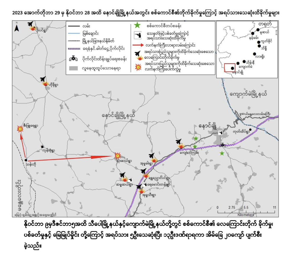အောက်တိုဘာလ ၂၇ ရက်က ညီနောင်မဟာမိတ်သုံးဖော် ဦးဆောင်သည့် “၁၀၂၇ စစ်ဆင်ရေး”အပြီး သျှမ်းမြောက်ရှိ ရေနံနှင့် သဘာဝဓာတ်ငွေ့ ပိုက်လိုင်းတလျှောက်ရှိ မြို့နယ်များကို စစ်ကောင်စီက လေကြောင်းမှလည်းကောင်း၊ ကုန်းကြောင်းမှလည်းကောင်း အဆင်အခြင်မဲ့ တိုက်ခိုက်မှုများကြောင့် အရပ်သား ၂၇ ဦးသေဆုံးပြီး ၃၃ ဦး ဒဏ်ရာရရှိခဲ့ကြောင်း ယမန်နေ့ ဒီဇင်ဘာလ ၂၀ ရက်တွင် ထုတ်ပြန်ထားသည်။