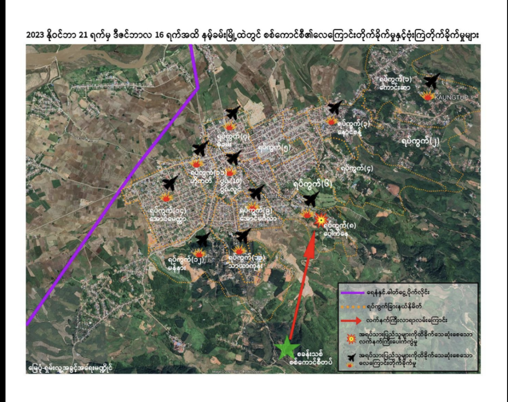 လက်ရှိ ညီနောင်မဟာမိတ်သုံးဖော် အလုံးစုံထိန်းချုပ်ထားသည့် နမ့်ခမ်းမြို့ကလည်း ၎င်းတို့မထိန်းချုပ်နိုင်ခင် ဒီဇင်ဘာလ ၁၆ ရက်က စစ်ကောင်စီသည် ရေနံနှင့် သဘာဝဓာတ်ငွေ့ ပိုက်လိုင်းနှင့် မီသာ ၄၀ သာကွာဝေးတဲ့ နမ့်ခမ်းမြို့နယ် ဟိုနားကျေးရွာကို လေကြောင်းဖြင့် ဗုံးကြဲတိုက်ခိုက်ခဲ့ရာ အရပ်သား ၅ ဦးသေဆုံးခဲ့ပြီး ၄ ဦးထိခိုက်ဒဏ်ရာရရှိကြောင်း ထုတ်ပြန်ချက်၌ ရေးသားဖော်ပြထားသည်။
