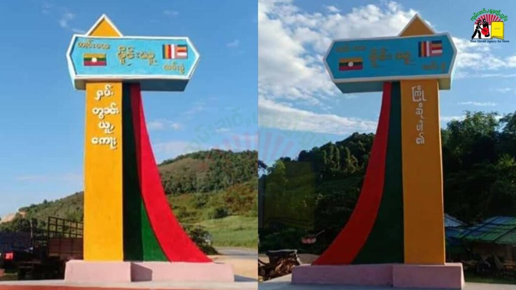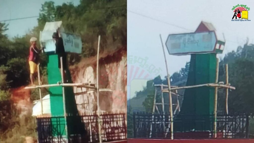 သျှမ်းပြည် ကွတ်ခိုင်မြို့နယ် မိုင်းယုလမ်းခွဲဆိုင်းဘုတ်တွင် မူရင်းရေးသားထားသည့် သျှမ်းစာနှင့် မြန်မာစာများ ဖျက်ဆီးခံလိုက်ရပြီး တအာင်း(ပလောင်)စာဖြင့် အစားထိုး ရေးသားထားကြောင်း စုံစမ်းသိရသည်။