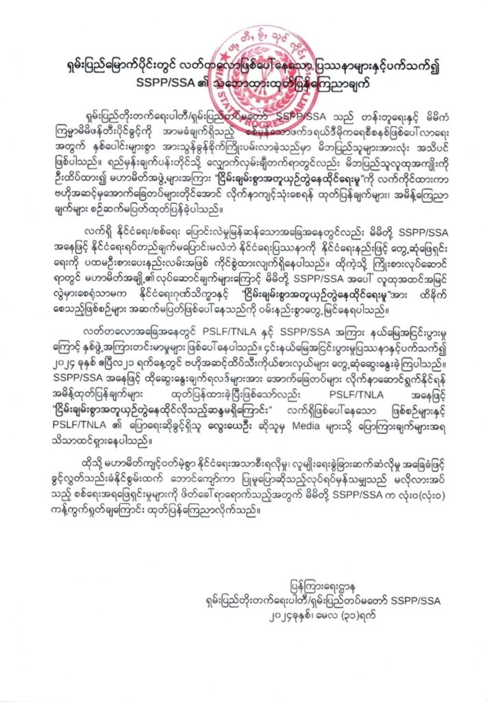 မဟာမိတ် ကျင့်ဝတ်မဲ့စွာ နိုင်ငံရေးအသားစီးရလိုမှု၊ လူမျိုးရေးခွဲခြားဆက်ဆံလိုမှု အခြေခံဖြင့် ခွင့်လွှတ် သည်းခံနိုင်စွမ်းထက် ဘောင်ကျော်ပြီး ပြုမှုပြောဆိုသည့် လုပ်ရပ် မှန်သမျှသည် မလိုလာအပ်သည့် စစ်ရေးအရ ဖြေရှင်းမှုများကို ဖိတ်ခေါ်ရာရောက်သည့် အတွက် SSPP/SSA မှ လုံးဝ ကန့်ကွက်ရှုချကြောင်း ထုတ်ပြန်ချက်တွင် ဖော်ပြထားသည်။