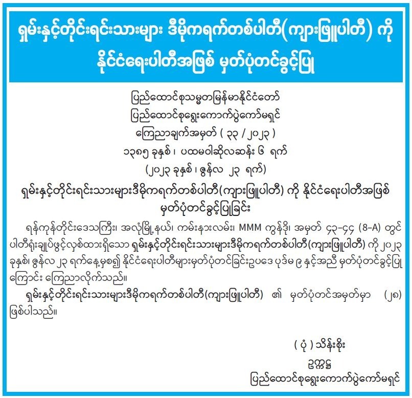 အဲ့တော့ ပြည်ထောင်စုကြီး ငြိမ်းချမ်းဖို့၊ အေးချမ်းသာယာဖို့၊ တရားဥပဒေစိုးမိုးဖို့၊ ပြည်သူလူထုတစ်ရပ်လုံး ဖွံ့ဖြိုးတိုးတက်ဖို့ဆိုရင် အရပ်သားအစိုးရ ဖြစ်ပေါ်လာမှ ဖြစ်မယ်။ အဲ့တော့ အရပ်သားအစိုးရ ဖြစ်ပေါ်လာအောင် ပါဝင်လုပ်ဆောင်ခြင်းပဲ ဖြစ်ပါတယ်။ တစ်နိုင်ငံလုံး ဝင်ပြိုင်မယ့် ပါတီဆိုရင် ပါတီဝင် ၅ သောင်းရှိရမယ်ဟုတ်၊ အခု အန်ကယ်တို့ပါတီက UEC ကို ပါတီဝင်အင်အား တစ်သိန်းရှစ်သောင်းကျော် တင်ထားတယ်။