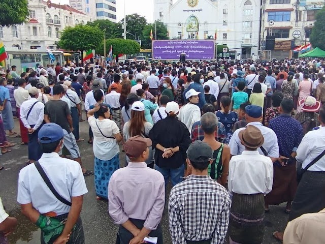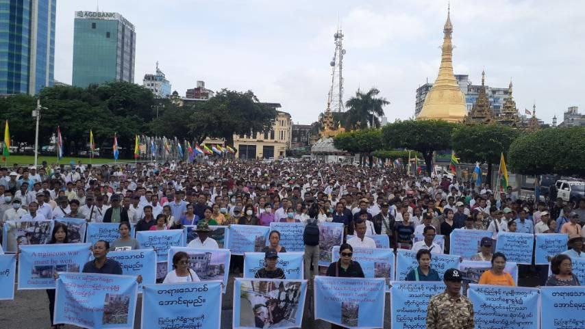 ယနေ့ သြဂုတ် ၆ ရက် နံနက်ပိုင်း ရန်ကုန်မြို့၊ မြို့တော်ခန်းမရှေ့တွင် ကိုးကန့်တပ်ဖွဲ့ MNDAA နှင့် ပူးပေါင်းအဖွဲ့များကို ကန့်ကွက်ရှုတ်ချအခမ်းအနား ကျင်းပခဲ့ကြောင်း သိရသည်။