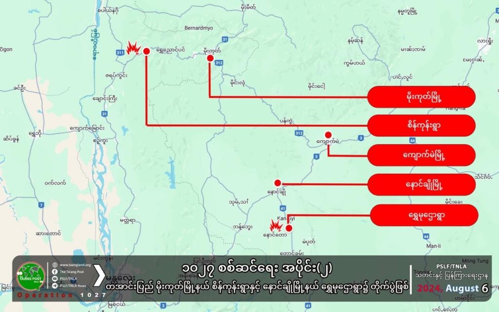 ယမန်နေ့ (ဩဂုတ်လ ၆ ရက်) နံနက် ၁၁ နာရီကျော်မှ စတင်ပြီး နောင်ချိုမြို့ တောင်ဘက်ရှိ ရွှေမုဋ္ဌောနှင့် ရေဖြူရွာအနီးတွင် တောင်ကြီး-ရပ်စောက်ဘက်မှ စစ်အင်အား ဖြည့်တင်းလာသည့် စစ်ကောင်စီယာဉ်တန်းကို TNLA နှင့် PDF ပူးပေါင်းတပ်ဖွဲ့တို့က တိုက်ခိုက်ခဲ့ရာ တိုက်ပွဲပြင်းထန်ခဲ့ကြောင်း ဒေသခံများက ပြောသည်။