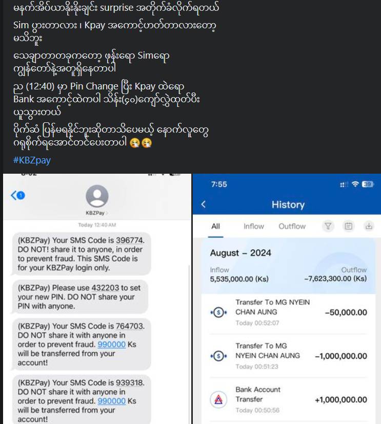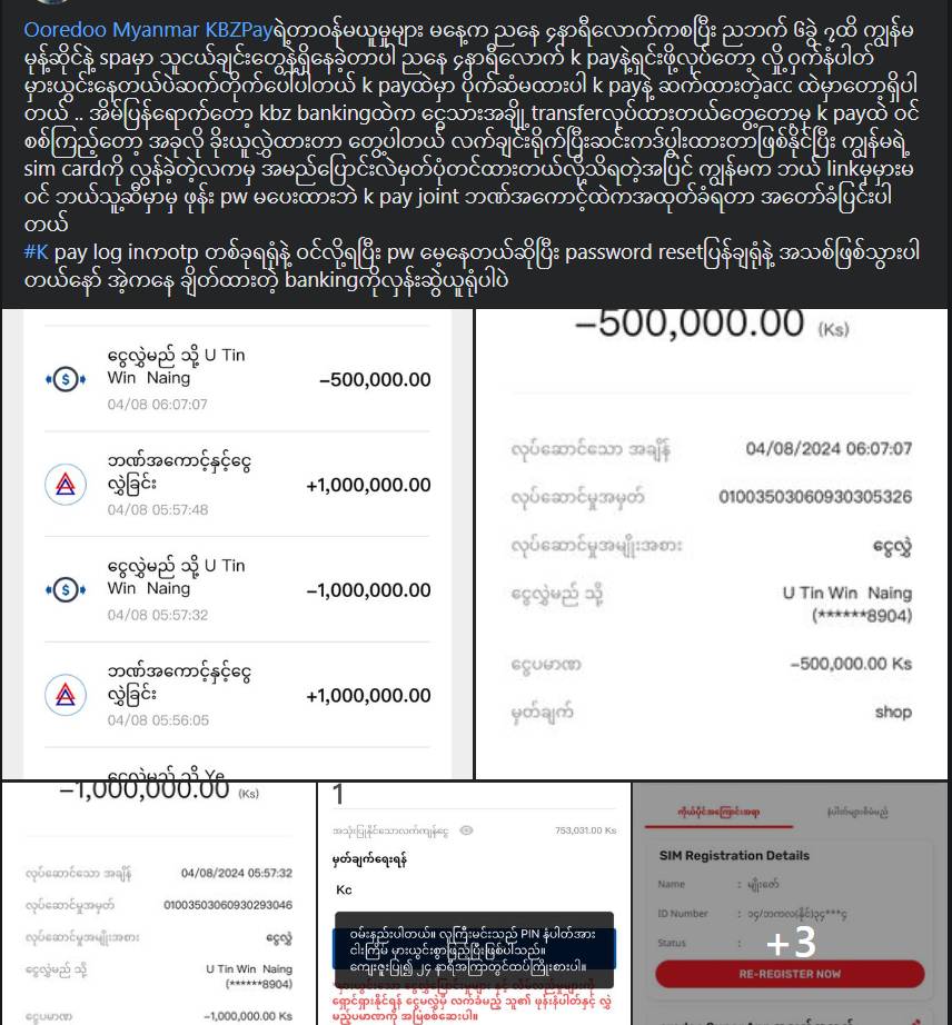 “ဆင်းမ်ကဒ် ပွားထားတာလား၊ Kpay အကောင့်ကို ဟက်သွားတာလားတော့ မသိဘူး သေချာတာကတော့ ဖုန်းရော ဆင်းမ်ကဒ်ရော ကျွန်တော်နှင့် တူတူရှိနေတာပါ ည ၁၂ နာရီ လောက်မှာ Pin change ပြီး Kpay ထဲရော ဘဏ်အကောင့်ထဲကပါ သိန်း (၄၀) ကျော် လွှဲထုတ်ပြီး ယူသွားတယ်” ဟု ၎င်း၏ လူမှုကွန်ယက်စာမျက်နှာတွင် ဖော်ပြထားသည်။