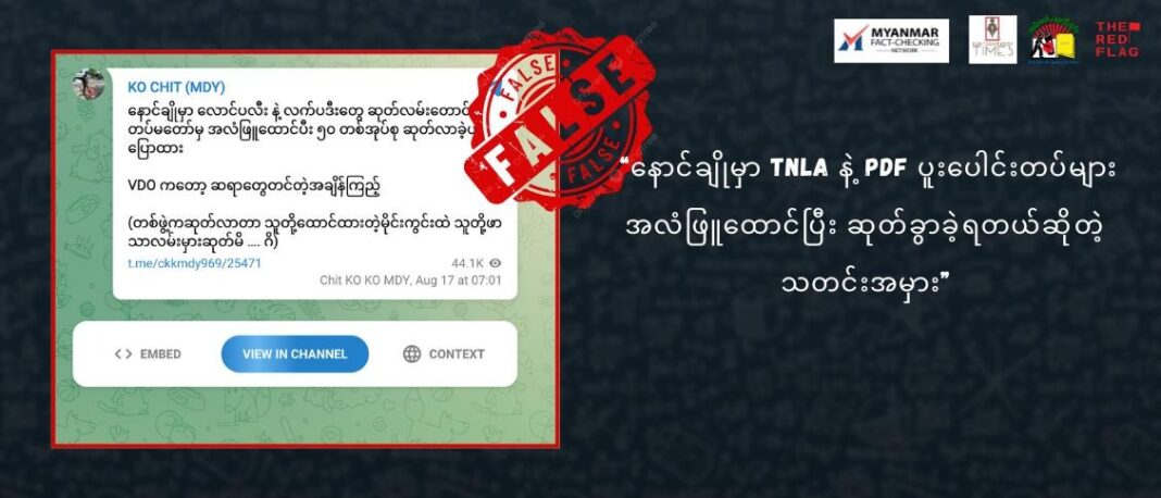 TNLA နဲ့ PDF ပူးပေါင်းတပ်ဖွဲ့များက နောင်ချိုမှာ အလံဖြူထောင်ပြီး ဆုတ်ခွာဖို့အတွက် စစ်ကောင်စီတပ်ထံ ခွင့်တောင်းတယ်ဆိုတဲ့ အကြောင်းအရာက မှားယွင်းနေတာတွေ့ရှိရပါတယ်။