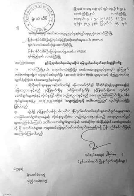 ထွေအုပ်ရုံးမှလည်း သက်ဆိုင်ရာ အိမ်ခြံမြေဝန်ဆောင်မှု အသင်းများရှိ အသင်းဝင်များမှ တရားမဝင်ဖော်ထုတ်ရောင်းချမှု ရှိ၊ မရှိ ပြန်လည် စီစစ်တင်ပြရန် အသိပေးထုတ်ပြန်လိုက်သည်။