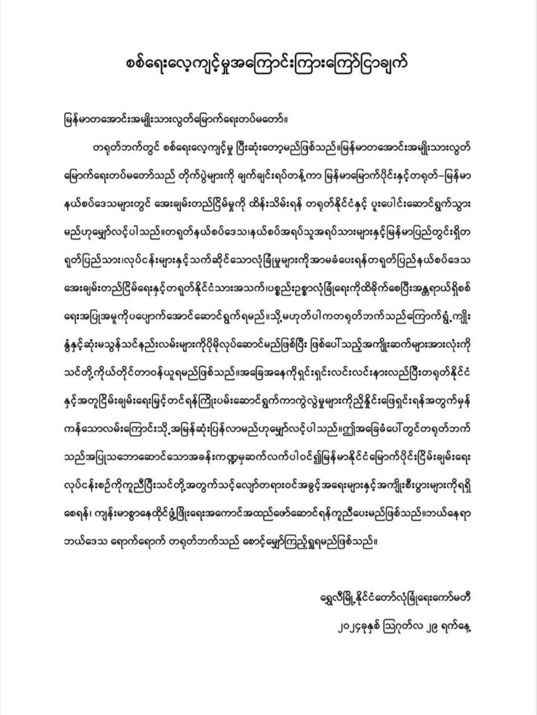 ထို့အပြင် တရုတ်ဘက်က အပြုသဘောဆောင်သည့် အခန်း ကဏ္ဏမှ ပါဝင်ပြီး မြန်မာနိုင်ငံ မြောက်ပိုင်း ငြိမ်းချမ်းရေး လုပ်ငန်းစဉ်များ ကူညီပြီး တရားဝင် အခွင့်အရေးနှင့် အကျိုးစီးပွါးများ ရရှိစေရန်၊ ကျန်းမာစွာ နေထိုင် ဖွံ့ဖြိုးရေး အကောင်အထည်ဆောင်ရန် ကူညီပေးမည်ဟု အဆိုပါ စာတွင် ဖော်ပြထားသည်။