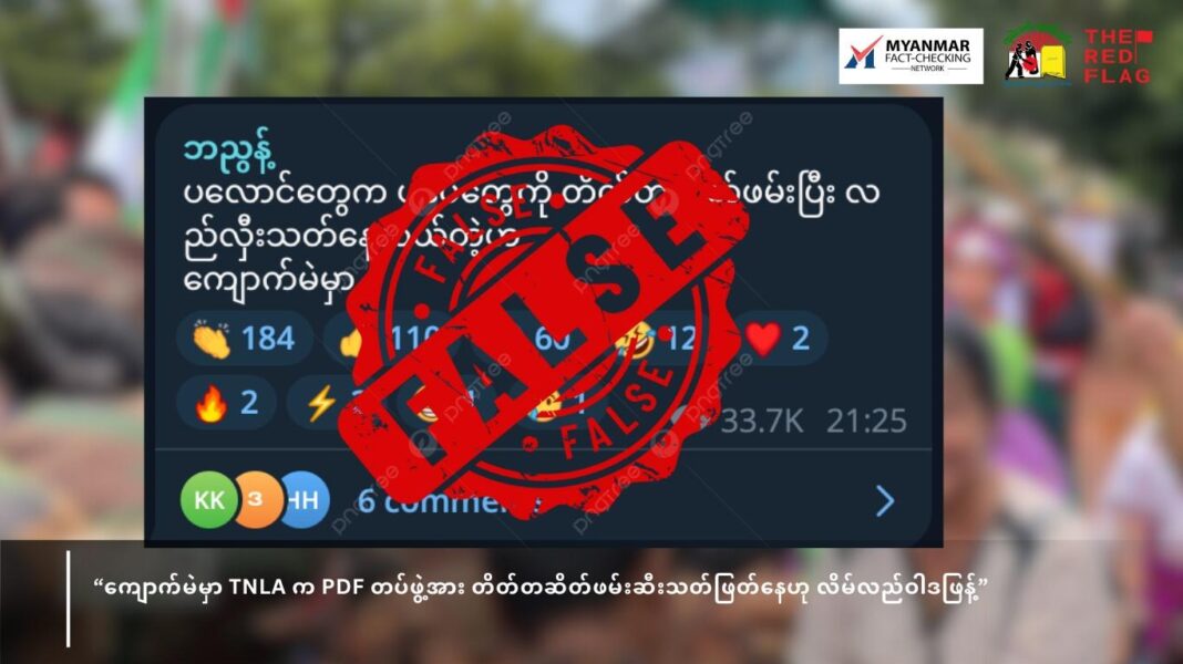 သတင်းအမှားဖြန့်ချိသူတွေက “TNLA က PDF တပ်ဖွဲ့အား တိတ်တဆိတ်ဖမ်းဆီးသတ်ဖြတ်နေ” ဟုဆိုပြီး ပြောဆိုထားသည့် အကြောင်းအရာမှာ ဝါဒဖြန့်ချိလှည့်ဖြားခြင်း ဖြစ်သည်။