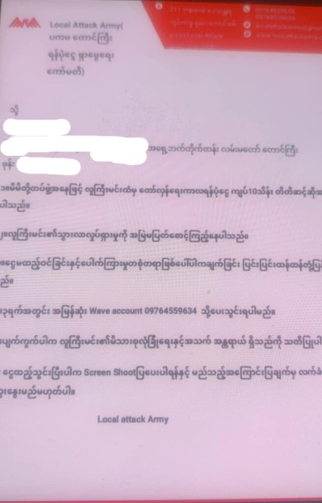 နိုဝင်ဘာလ ၂၀ ရက်နောက်ပိုင်း တောင်ကြီးမြို့ပေါ်ရှိ စီးပွားရေးလုပ်ငန်းရှင်များထံ Local Attack Army ပကဖ တောင်ကြီး ရန်ပုံငွေရှာဖွေရေးကော်မတီအမည်ဖြင့် တော်လှန်ရေးရန်ပုံငွေ ထည့်သွင်းရန်အကြောင်းကြားစာ ပေးပို့မှုများရှိနေကြောင်း မြို့ခံ သတင်းရင်းမြစ် တစ်ဦးက သျှမ်းသံတော်ဆင့်သို့ပြောသည်။