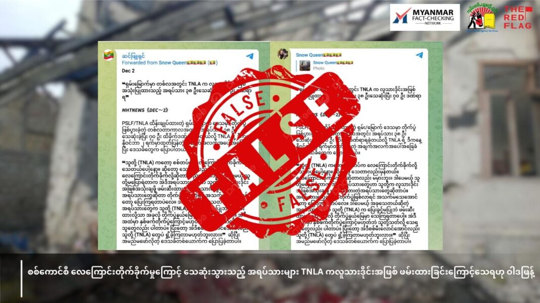 စစ်ကောင်စီအာပေး တယ်လီဂရမ် ဝါဒဖြန့်ချန်နယ်လ်တစ်ခုဖြစ်သည့် Snow Queen ချန်နယ်လ်မှ ဒီဇင်ဘာလ ၂ ရက်နေ့တွင် ဖြန့်ချိခဲ့ပြီး TNLA ထုတ်ပြန်သည့် အချက်အလက်အပေါ်အခြေခံကာ ဒေသခံများက ပြောပြခဲ့သည်ဟုဆိုပြီး ရေးသားဖြန့်ချိခဲ့သည်။