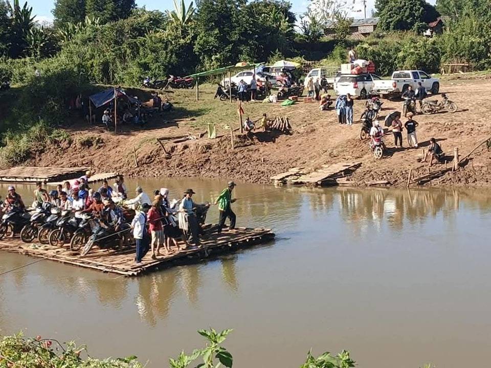 ပုံစာ (၂၊ ၃၊ ၄) – အီနိုင်းတံတား ပြုပြင်နေစဉ် ယာဉ်နှင့် ခရီးသည်များ ဖောင်ဖြင့် ချောင်းကူးနေစဉ်