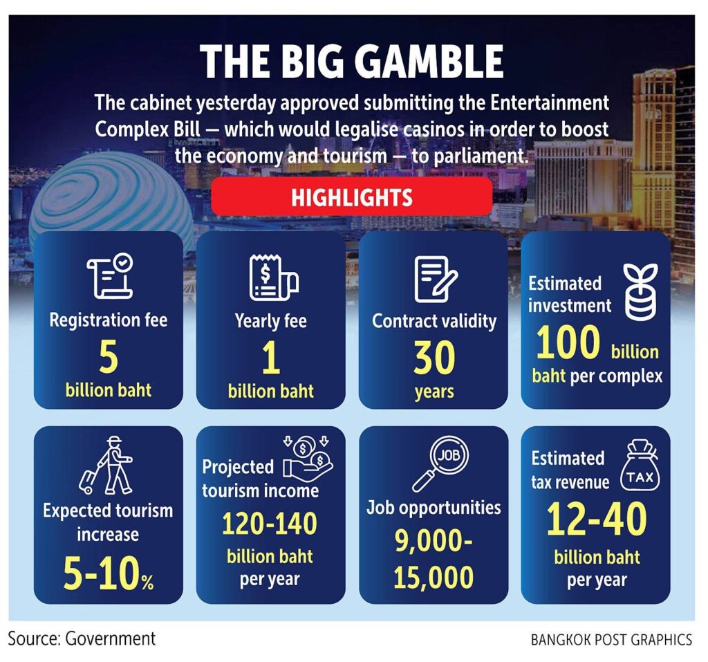 ထိုင်းနိုင်ငံ၏ ခရီးသွားလုပ်ငန်းနှင့် အလုပ်အကိုင်အခွင်အလမ်းများပိုမိုမြင့်တက်လာစေရန် ထိုင်းအစိုးရမှ လောင်းကစားလုပ်ငန်းများ၊ ကာစီနိုလုပ်ငန်းများအား တရားဝင်ခွင့်ပြုမည့် ဥပဒေမူကြမ်းအား အတည်ပြုကြောင်း ထိုင်းဝန်ကြီးချုပ် ပေထုံတန်ရှင်နာဝပ်က ပြောကြားသည်။