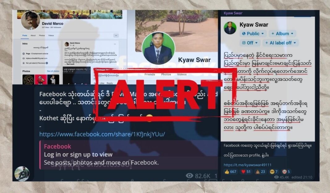 ဥပမာအားဖြင့် အခုဆိုရင် Facebook Platform မှာ ဒေသအခြေပြုအမည်တွေနဲ့ Page တွေက အများအပြား ပေါ်ပေါက်နေတာကို တွေ့ရှိရတယ်။ ဒါပေမယ့် ရေးသားတဲ့ အကြောင်းအရာ (Content) တွေက ဒေသခံတွေ ရေးသားတာထက် စစ်ကောင်စီဝါဒဖြန့် တယ်လီဂရမ်ချန်နယ်တွေက ရေးသားတဲ့ အသုံးအနှုန်း၊ အပြောအဆို၊ ပုံစံတွေနဲ့ တူညီနေတာကို တွေ့ရှိရတယ်။ အဲ့ဒီအပြင် အဲဒီပို့စ်တွေကို တယ်လီဂရမ်မှာရှိတဲ့ စစ်ကောင်စီဝါဒဖြန့် ချန်နယ်တွေက Screenshotတွေ ရိုက်ပြီး ပြန်ဖြန့်ချိတယ်။