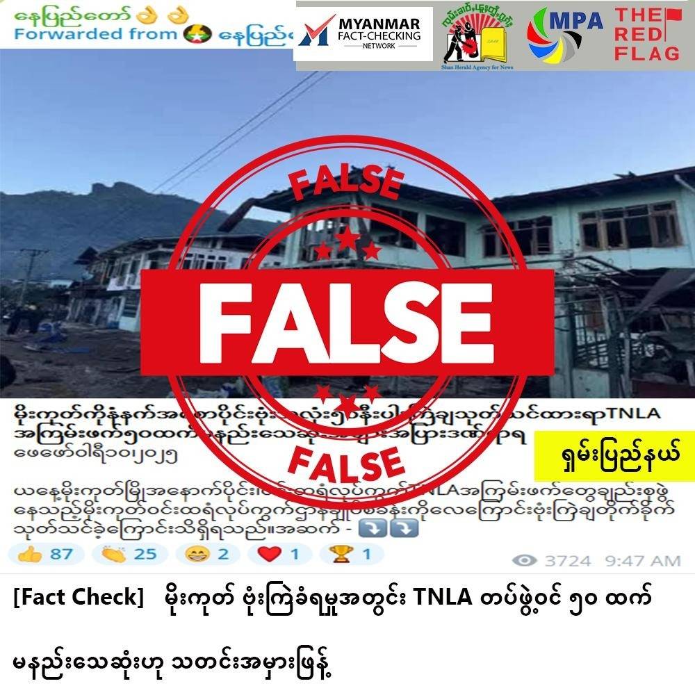 စစ်ကောင်စီ ဝါဒဖြန့်ချန်နယ်တွေက စစ်ရာဇဝတ်မှုကျူးလွန်နေသော စစ်ကောင်စီကို ဖုံးကွယ်ရန် အရပ်သားသေဆုံးမှုကို TNLA တပ်ဖွဲ့ဝင်များ သေဆုံးနေသယောင် လိမ်လည်လှည့်ဖြားရေးသား ဝါဒဖြန့်ချိနေခြင်း ဖြစ်သည်။