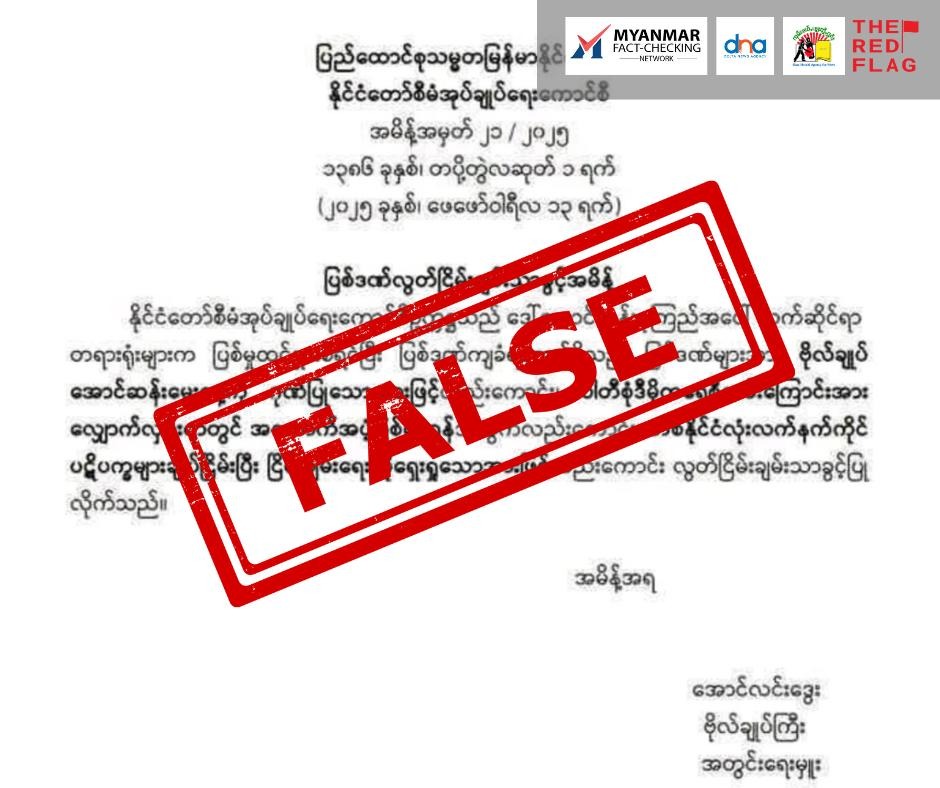 အဲ့ဒီပျံ့နှံ့လာတဲ့သတင်းကို MFCN အဖွဲ့ဝင်ဖြစ်တဲ့ DNA Fact Check အဖွဲ့နဲ့ Shan News Fact Check ကနေ စစ်ဆေးကြည့်တဲ့အခါမှာ ပျံ့နှံ့နေတဲ့ထုတ်ပြန်ချက်ကအတုဖြစ်နေတာကိုတွေ့ရှိရပြီး သတင်းမှားဖြစ်ကြောင်းအတည်ပြုနိုင်ခဲ့ပါတယ်။