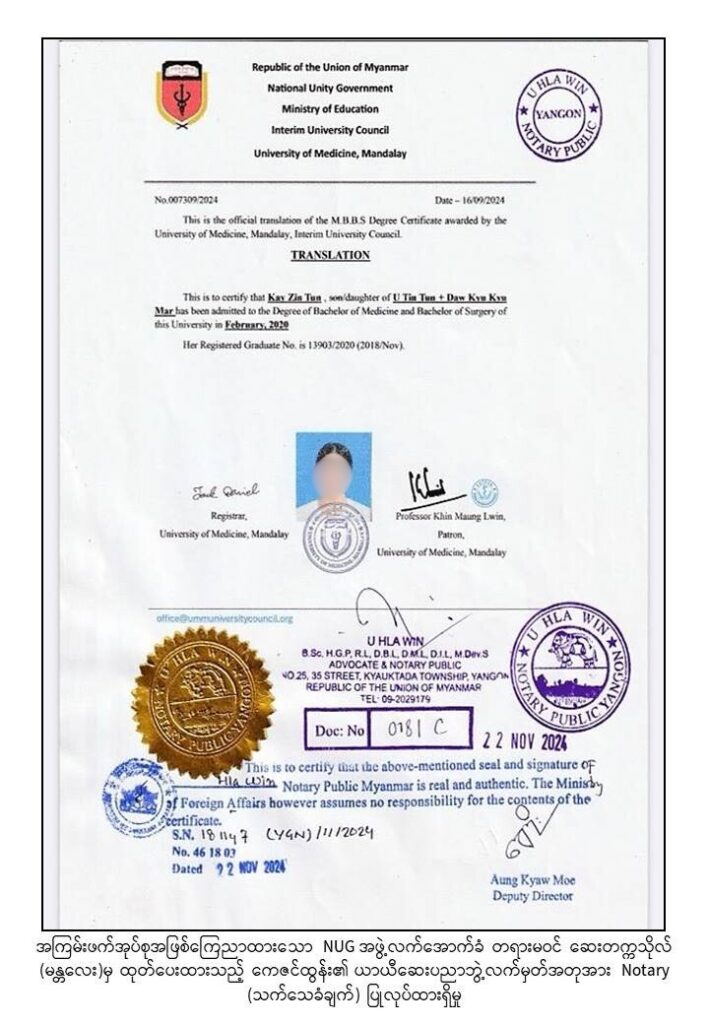 ထိုသို့ အကြောင်းကြားပြီး စိစစ်ခဲ့ရာ NUG လက်အောက်ခံ ဆေးတက္ကသိုလ် (မန္တလေး) မှ ထုတ်ပေးသည့် ယာယီဆေးပညာဘွဲ့လက်မှတ် (အတု) ဖြစ်နေကြောင်း ဆိုသည်။