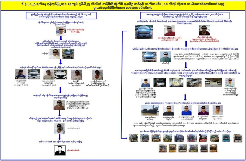 UWSA ထိန်းချုပ် ‘ဝ’ဒေသ ပန်ဆန်းမြို့တွင် နေထိုင်သည့် တင်မောင်ဝင်း ၏ အစီအမံဖြင့် ရန်ကုန်တိုင်းအတွင်း တောင်ဒဂုံ၊ မြောက်ဒဂုံ၊ သာကေတ၊ မြောက်ဥက္ကလာပနှင့် ဆိပ်ကြီးခနောင်တို မြို့နယ်တို့တွင် တဆင့်ပြန်လည် ရောင်းချသူများကို စိတ်ပြောင်းဆေးဝါးများ၊ စက်လှေနှင့် မော်တော်ယာဉ်များနှင့် အတူ ဖမ်းဆီးရမိကြောင်း ဓာတ်ပုံမှတ်တမ်းဖြင့် စစ်ကောင်စီက ထုတ်ပြန်သည်။