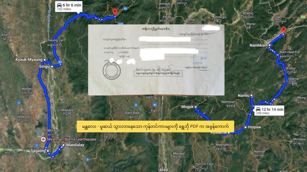 “၆ ဘီး နဲ့ ၁၀ ဘီးကားတွေပေါ့။ မန္တလေးက စစ်ကိုင်းဘက်ကို ဆင်းပြီး စဉ့်ကူးဘက်ကို ဖြတ်ပြီးတော့ သပိတ်ကျင်းကနေ မိုးကုတ်ဘက်ကို ခရီးဆက်တာပေါ့။ ငလျင်ပြီး နောက်ပိုင်းတော့ သိပ်မများတော့ဘူး သွားတာ”ဟု ၎င်းက ပြောသည်။