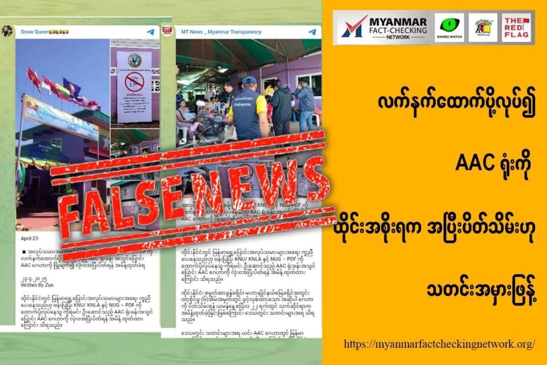 အဆိုပါ သတင်းအမှားကို MT News – Myanmar Transparency အမည်ဖြင့် တယ်လီဂရမ်ချန်နယ်မှ ဧပြီလ ၂၃ ရက်နေ့တွင် ဖြန့်ချိခဲ့ပြီး “အလုပ်သမားအရေးဗန်းပြပြီး KNU/ KNDF နှင့် NUG-PDF ကို လက်နက်ထောက်ပို့ လုပ်နေသည့် AAC ရုံးခန်း အသွင်ပြောင်း AAC ဂေဟာကို ဖြိုဖျက်၍ လုံးဝအပြီးပိတ်ရန် အမိန့်ထုတ်ခံရ” ဟု (မူရင်းအတိုင်း) ရေးသားဖော်ပြခဲ့သည်။