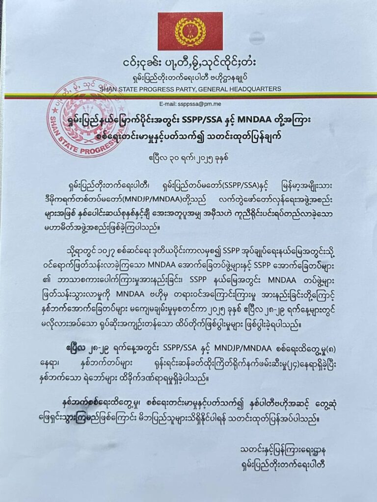 ရှမ်းပြည်တိုးတက်ရေးပါတီ/ ရှမ်းပြည်တပ်မတော် (SSPP/SSA) နှင့် ကိုးကန့်တပ်ဖွဲ့ MNDAA တို့အကြား ဖြစ်ပွားနေသည့် စစ်ရေးထိတွေ့မှု၊ စစ်ရေးတင်းမာမှုနှင့် ပတ်သက်၍ နှစ်ပါတီ ဗဟိုအဆင့် တွေ့ဆုံဖြေရှင်းသွားမည်ဖြစ်ကြောင်း SSPP ဘက်မှ ထုတ်ပြန်လိုက်သည်။
