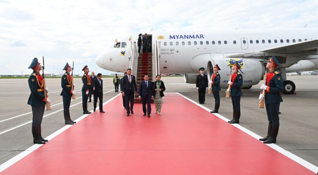 ရုရှားစံတော်ချိန် မေလ ၇ ရက်နေ့ ညနေ ၄ နာရီတွင် စစ်ခေါင်းဆောင် မင်းအောင်လှိုင်နှင့် အဖွဲ့များသည် ရုရှားနိုင်ငံ မော်စကိုမြို့သို့ ရောက်ရှိခဲ့သည်။