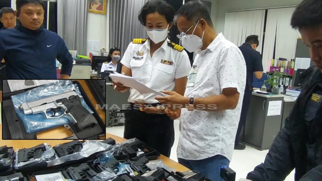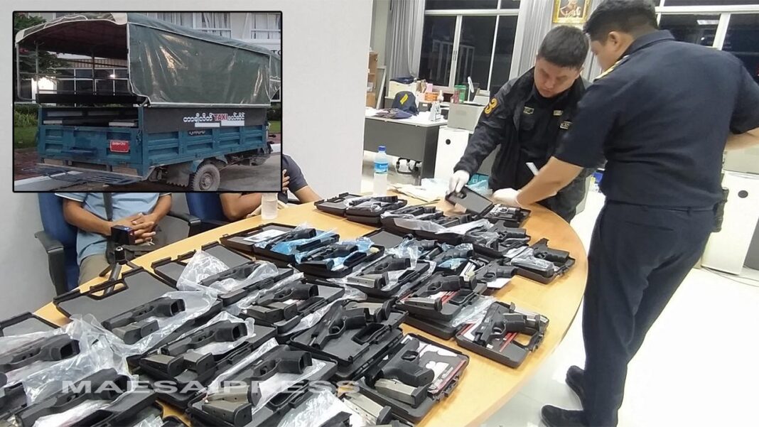 မေလ ၃၁ ရက်နေ့ ညနေပိုင်း ၆ နာရီဝန်းကျင်တွင် ထိုင်းနိုင်ငံ မယ်ဆိုင်ဘက်မှ မြန်မာနိုင်ငံ တာချီလိတ်ဘက်သို့ ဝင်ရောက်ရန် တံတားတွင် တန်းစီးနေသည့် သုံးဘီးယာဉ်တစ်စီးကို ထိုင်းအကောက်ခွန်ဂိတ်မှ စစ်ဆေးရာ ကောက်ရိုးထုံးအတွင်းဝှက်ထားသည့် လက်လုပ်ပစ္စတိုသေနတ် ၂၅ လက်ကို ဖမ်းရမိခြင်းဖြစ်ကြောင်း မယ်ဆိုင်သတင်းက ဖော်ပြသည်။