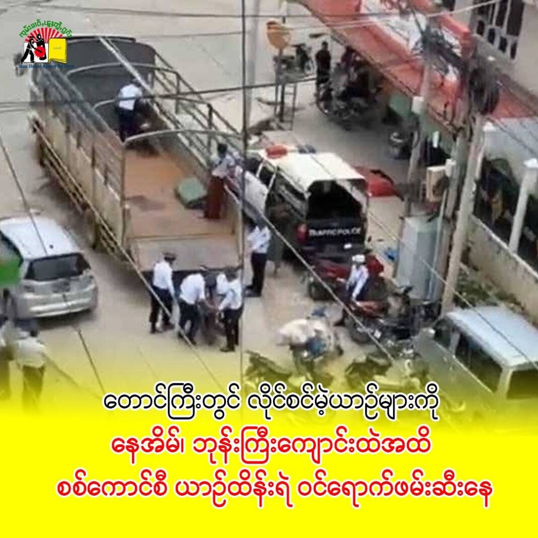 ယမန်နေ့ (ဇွန်လ ၁ ရက်)တွင် စစ်ကောင်စီလက်အောက်ခံ ရဲတပ်ဖွဲ့နှင့် ယာဉ်ထိန်းရဲများက တောင်ကြီးမြို့ လမ်းဆုံ၊ ရပ်ကွက်လမ်းများတွင် လိုင်စင်မဲ့ ကားနှင့် ဆိုင်ကယ်များကို ပိတ်ဆို့ဖမ်းဆီးနေပြီး ဖမ်းဆီးခံရသည့် ကားနှင့် ဆိုင်ကယ်များကို ပြန်လည်ရွေးထုတ်၍ မရတော့ကြောင်း မြို့ခံများက ပြောသည်။