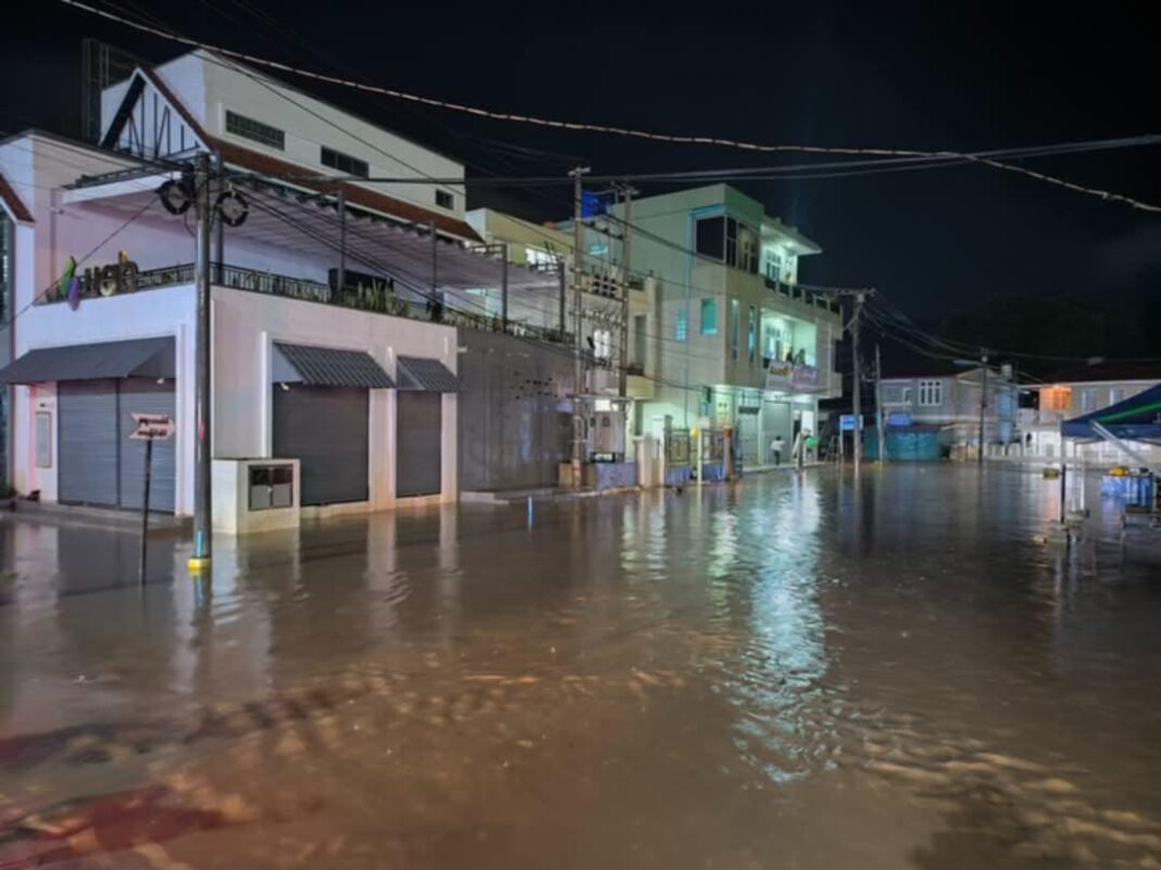 ပြီးခဲ့သည့် ရက်ပိုင်းက အဆက်မပြတ် ရွာသွန်းနေသည့် မိုးကြောင့် ချောင်းရေ မြင့်တက်လာရာ မြို့လယ်ပိုင်း ရပ်ကွက် (၄) ရှိ ခရီးသွားများကြား ကျော်ကြားသည့် ပလောင်းဈေး နေရာ ရေဝင်ရောက်နေပြီး၊ ရပ်ကွက် (၂) စခန်းသာ နှင့် ရပ်ကွက် (၃) ချောင်းဘေး နေအိမ်များ စောင့်ကြည့်နေရသည်ဟု မြို့ခံ တဦးက ဆိုသည်။