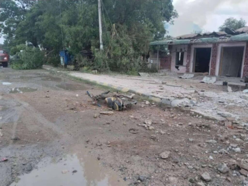 ပုံစာ – ယနေ့ ဇူလိုင် ၁၄ ရက် ညနေပိုင်းတွင် သီပေါမြို့ လေကြောင်းဗုံးကြဲခံရပြီးနောက် ထိခိုက်ပျက်စီးမှု (ဓာတ်ပုံ – ဒေသခံ)