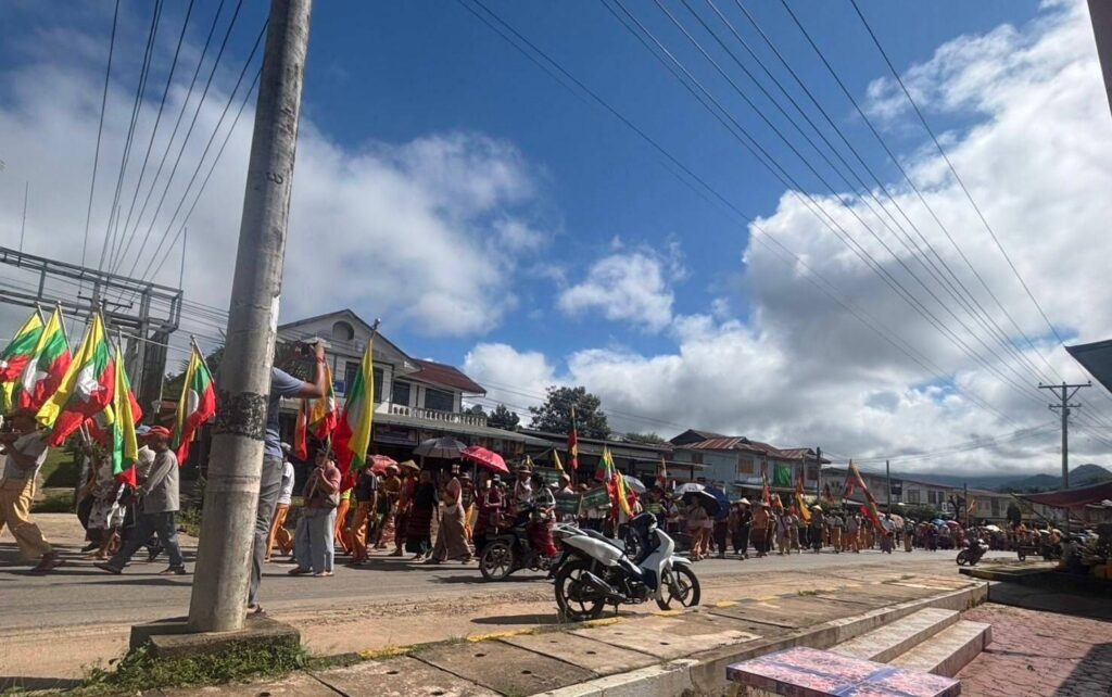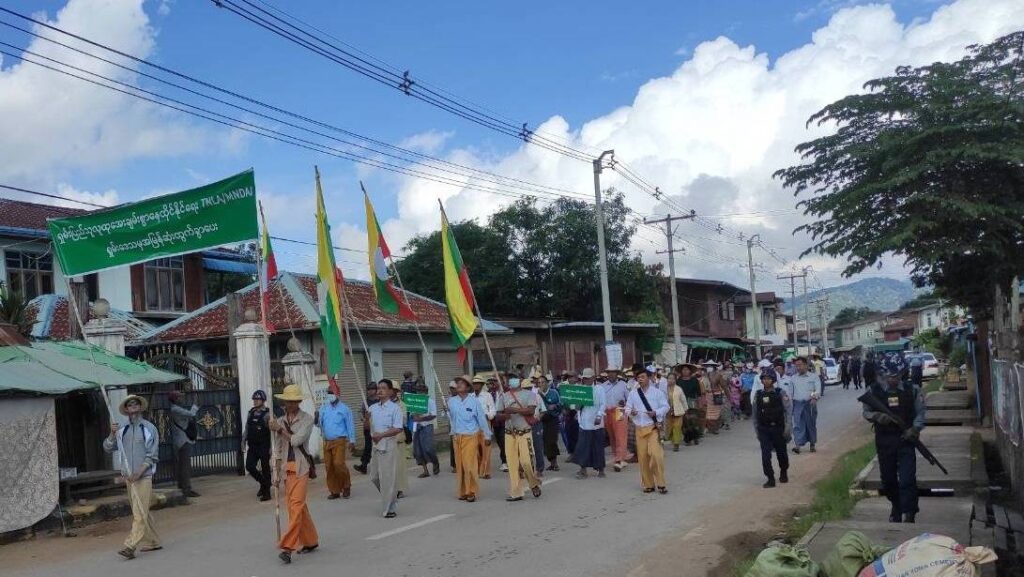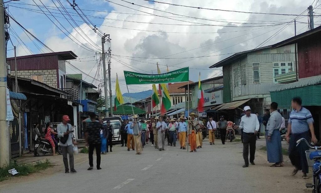 ယနေ့ (ဩဂုတ်လ ၁၈ ရက်) နံနက်ပိုင်းတွင် သျှမ်းပြည်တောင်ပိုင်းရှိ မိုးနဲမြို့၊ မိုင်းပန်မြို့နှင့် ကွန်ဟိန်းမြို့တို့မှ ဒေသခံများကို စစ်ကော်မရှင်လက်အောက်ခံများမှ ညီနောင်မဟာမိတ်အဖွဲ့ဝင် TNLA နှင့် MNDAA တို့ကို ဆန့်ကျင်ကြောင်း မြို့ပေါ်တွင် စီတန်းလှည့်လည်ကာ ဆန္ဒပြခိုင်းခဲ့သည်။