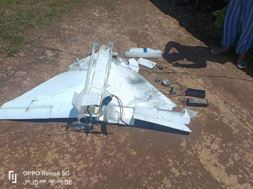 ပုံစာ – ကျောက်မဲမြို့ပေါ် ပျက်ကျခဲ့သည့် စစ်ကောင်စီတပ် အသေခံဒရုန်း (ဓာတ်ပုံ – ဒေသခံ)