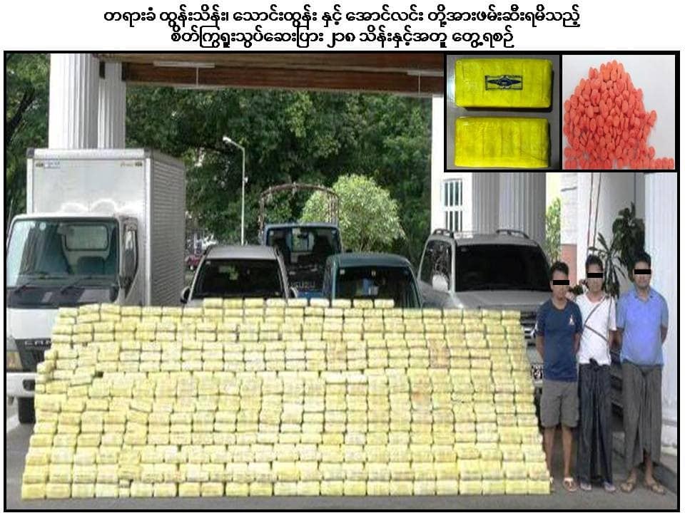 ပြီးခဲ့သည့် သြဂုတ် ၅ ရက်မှ ၁၅ ရက်အတွင်း ရခိုင်ပြည်နယ်မှတဆင့် ဘင်္ဂလားဒေ့ရှ်နယ်စပ်နှင့် မလေးရှား ရေပိုင်နက်သို့ ပို့ဆောင်မည့် ကျပ် ၂၅၇ ဘီလီယံကျော် တန်ဖိုးရှိ မူးယစ်ဆေးဝါးများကို ဖမ်းဆီးရမိကြောင်း စစ်ကော်မရှင်လက်အောက်ခံ မူးယစ်/ရဲတပ်ဖွဲ့က သြဂုတ် ၂၂ ရက်တွင် သတင်းထုတ်ပြန်သည်။