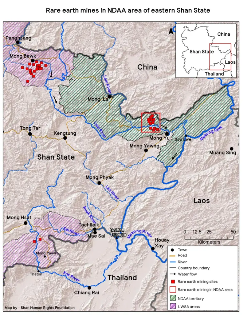 အဆိုပါ မိုင်းလားတပ်ဖွဲ့ NDAA ထိန်းချုပ်ထားသော မိုင်းယောင်းမြို့နယ်အတွင်း တူးဖော်နေသည့် မြေရှားသတ္တုတွင်း နေရာသည် မဲခေါင်မြစ်နှင့် ကီလို ၄၀ ခန့်သာ ကွာဝေးကြောင်း SHRF ထုတ်ပြန်ချက်တွင် ရေးသားထားသည်။