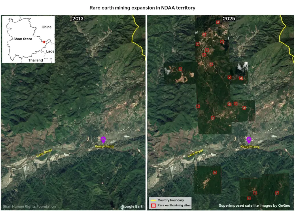 လွန်ခဲ့သည့် ၂၀၂၁ ခုနှစ်တွင် မိုင်းယောင်းမြို့နယ်ထဲ မြေရှားသတ္တုတွင်း (၃) နေရာသာ ရှိသော်လည်း ယခု ၂၀၂၅ ခုနှစ်တွင် မြေရှားသတ္တုတွင်း (၁၉) ခုထက်မနည်း တိုးလာနေကြောင်း ဂြိုလ်တုဓာတ်ပုံများနှင့် ဗီဒီယိုများက ဖော်ပြနေကြောင်း SHRF ထုတ်ပြန်ချက်တွင် ဖော်ပြထားသည်။