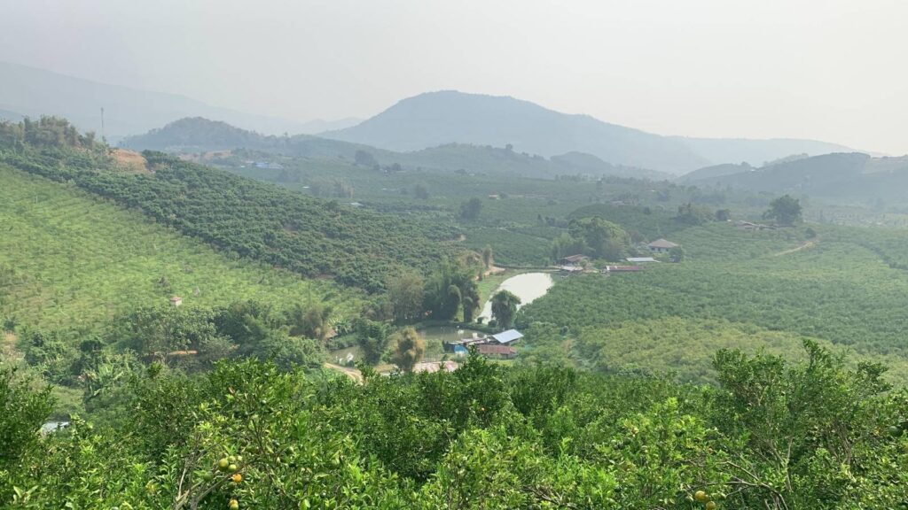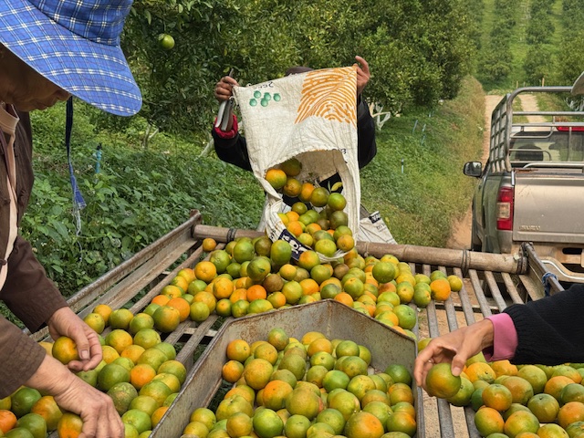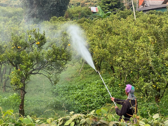 စိမ်းလန်းစိုပြေနေသော ထိုင်းနိုင်ငံ မြောက်ပိုင်းရှိ လိမ္မော်စိုက်ခင်းထဲတွင် ပိုးသတ်ဆေး အနံ့များမှာ ပြင်းရှရှ။