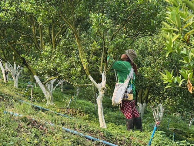ကျယ်ပြောလှသော တောင်ကုန်းတောင်တန်းပေါ်ရှိ လိမ္မော်ပင်များ အကြားတွင် အလုပ်သမားများသည် စူးရှပြင်းထန်လှသည့် ပိုးသတ်ဆေးအနံ့ကို မရှူမိလေအောင် နှာခေါင်းကို မျက်နှာအုပ်ခေါင်းစွပ် တပ်ထားရသည်။