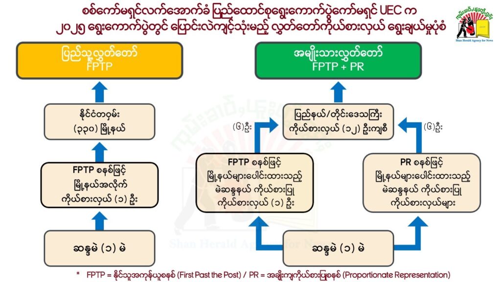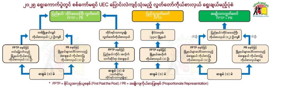 မေး ။ ။ စစ်ကော်မရှင်လက်အောက်ခံ ပြည်ထောင်စုရွေးကောက်ပွဲကော်မရှင်က ပြောင်းလဲကျင့်သုံးမယ့် နိုင်သူ အကုန်ယူစနစ် FPTP နဲ့အချိုးကျ ကိုယ်စားပြုစနစ် PR အကြောင်းကို ရှင်းပြပေးပါဦး။