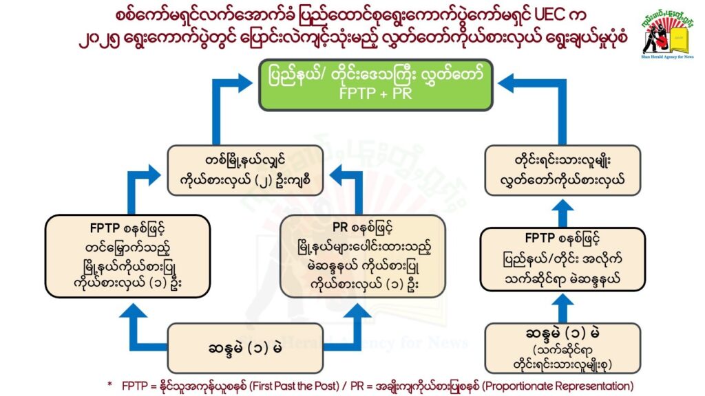 မဲအများဆုံးရရှိသူ အနိုင်ရသည့် (First Past the Post – FPTP) စနစ်နှင့် အချိုးကျကိုယ်စားပြု (Proportionate Representation) စနစ်ကိုပေါင်းစပ်အသုံးပြု၍ ကျင်းပမည့် မဲဆန္ဒနယ်များကိုလည်း တပြိုင်တည်း ထုတ်ပြန်ခဲ့ရာ ရွေးကောက်ပွဲ အပိုင်း(၁) ကျင်းပသွားမည့်ထဲတွင် သျှမ်းပြည်မှ (၁၂) မြို့နယ် ပါဝင်ခဲ့သည်။