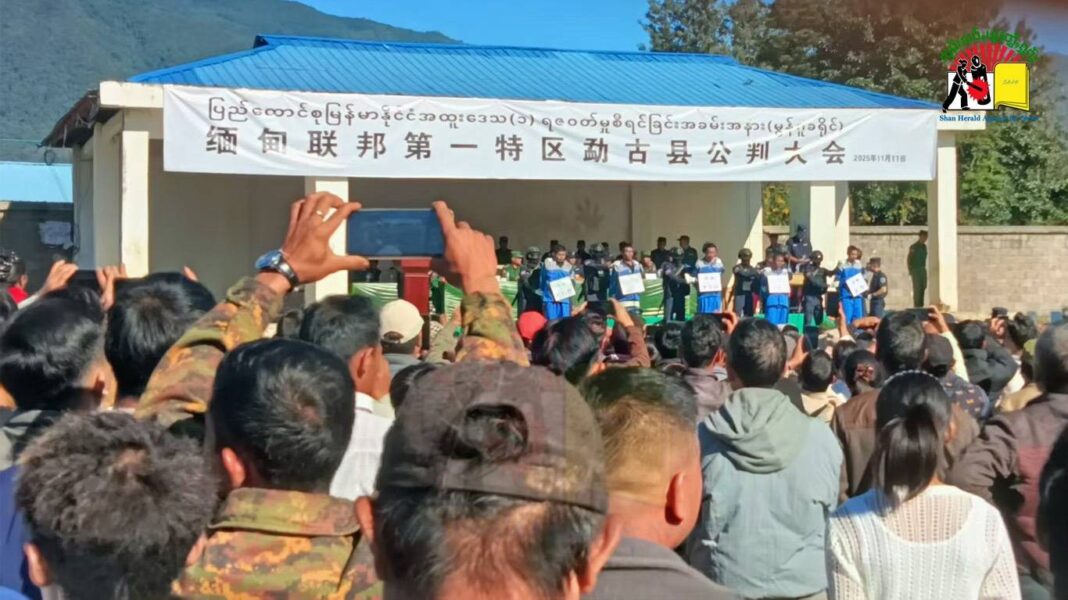 ယနေ့ (နိုဝင်ဘာလ ၁၁ ရက်) နံနက်ပိုင်းတွင် မူဆယ်မြို့နယ် မုံးကိုးမြို့၌ ကိုးကန့်တပ်ဖွဲ့ MNDAA မှ “အထူးဒေသ(၁) ရာဇဝတ်မှုစီရင်ခြင်း အခမ်းအနား” အမည်ဖြင့် လူသတ်မှုနှင့် မုဒိမ်းမှု ကျူးလွန်ခဲ့သူ အမျိုးသား (၅) ဦးတို့ကို သေဒဏ် အပါအဝင် ထောင်ဒဏ်ချမှတ်ခဲ့ကြောင်း အဆိုပါ ကြားနာပွဲသို့ တက်ရောက်ခဲ့သူ ဒေသခံ အမျိုးသားတစ်ဦးက ပြောသည်။