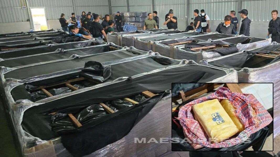 ပြီးခဲ့သည့် နိုဝင်ဘာလ ၁၀ ရက်နေ့လယ် ၁ နာရီခွဲတွင် ထိုင်းအာဏာပိုင်များသည် ချင်းရိုင်မြို့ရှိ ဂိုဒေါင်တစ်ခုကို ဝင်ရောက်စစ်ဆေးခဲ့ရာ ဆိုဖာအသစ် ၃၄ လုံးအတွင်း ဝှက်ထားသော မက်သာဖက်သမင်း ဆေးပြား ၁၀ သန်း (၁၀,၀၀၀,၀၀၀) ခန့်ကို သိမ်းဆည်းရမိခြင်း ဖြစ်ကြောင်း ဆိုသည်။