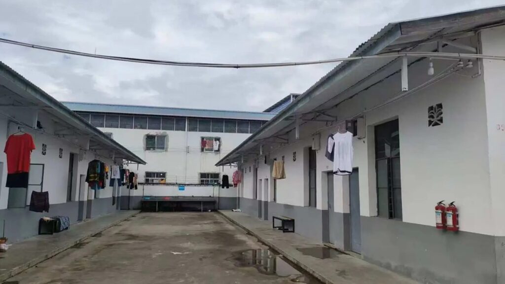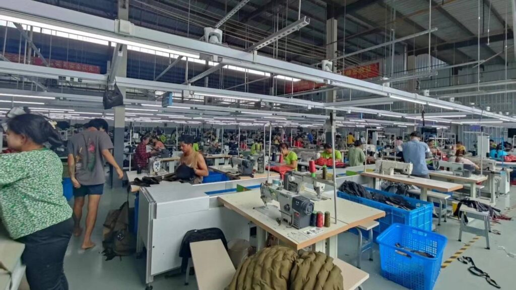 တရုတ်နယ်စပ် အထည်ချုပ်စက်ရုံ၏ အေးစက်စက် ကြမ်းပြင်ပေါ်တွင် မေဇင် (အမည်လွှဲ) ရပ်နေသည်။